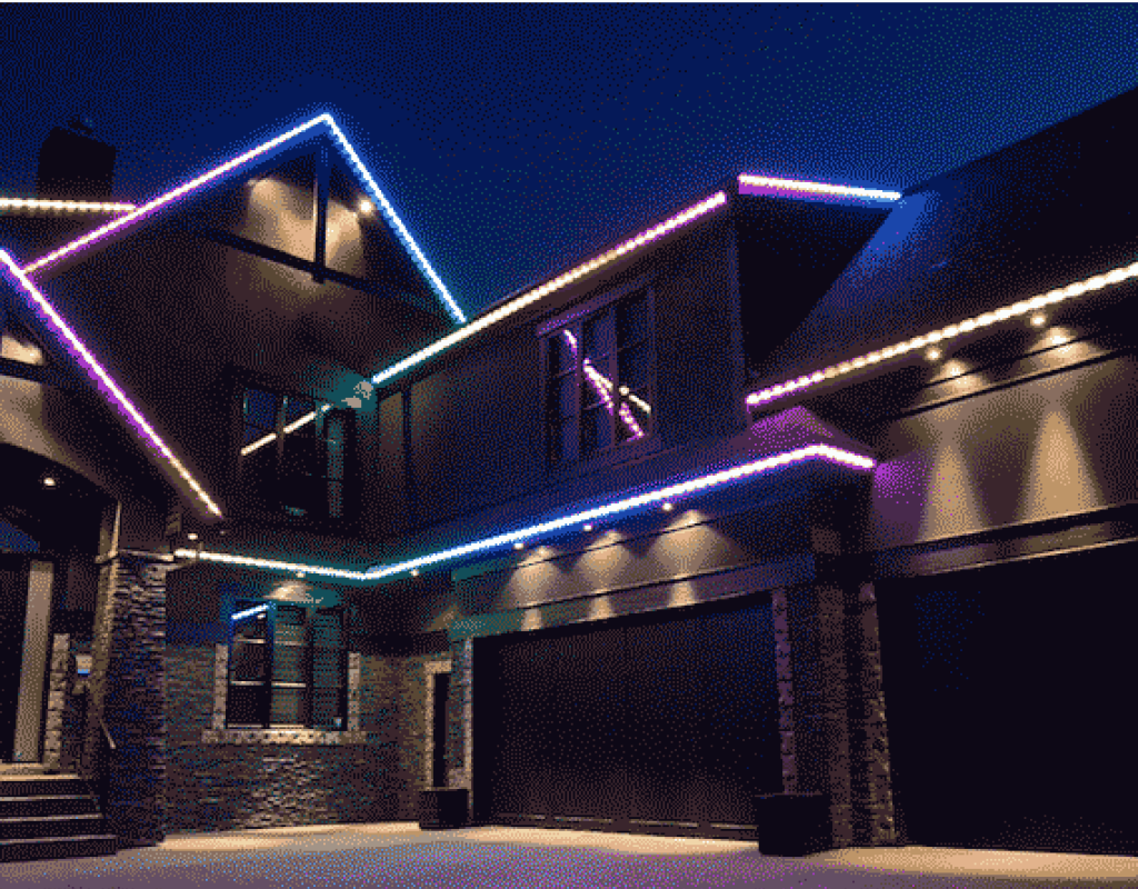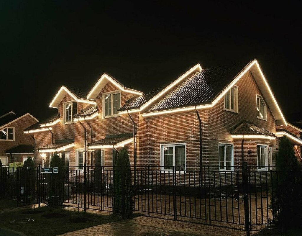 Неон выигрышно выделяет все архитектурные детали здания за счет равномерного яркого свечения. Используется для стильной контурной подсветки фасадов, скатов крыши и крыльца. Иллюминация представляет собой гибкую светодиодную ленту, которая запаяна в оболочку из ПВХ. Можно использовать всесезонно. ПВХ оболочка не дубеет и не трескается на морозе при температуре до – 50°С. Сохраняет свои свойства летом при воздействии солнечного света.